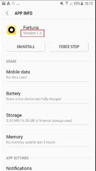 Pentru a afla ce versiune a aplicației Fortuna ai descărcată, te rugăm să urmezi acești pași: Deschide "Setari" Deschide secțiunea de "Aplicații" Localizează și deschide aplicația Fortuna. Sub numele aplicației poți vedea versiunea instalată în prezent pe dispozitiv