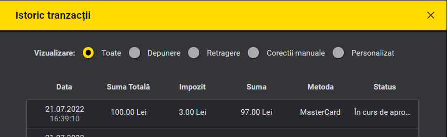 - dacă cererea ta de retragere a fost deja procesată, ai posibilitatea de a accesa Contul meu - Tranzacții - Istoric Tranzacții. Printr-un click pe tranzacția de retragere procesată ți se vor afișa toate informațiile relevante ale retragerii tale.