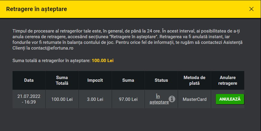 - dacă ai o cerere de retragere în așteptare, poți accesa Contul meu - Tranzacții - Retragere în așteptare. În această secțiune vei regăsi detaliile privind suma ce a fost reținută pentru impozit, suma pe care o vei primi precum și suma totală retrasă din contul tău de joc