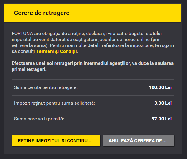 În momentul în care înregistrezi o cerere de retragere ți se vor afișa în cadrul unui mesaj de tip pop-up următoarele detalii: