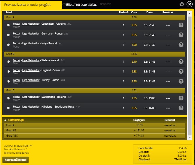 Fortuna îți oferă posibilitatea de a vizualiza toate combinațiile de câștig atribuite biletului tău DOMINO înainte de plasarea acestuia. Prin selectarea rubricii ”Defalcări” afișată în colțul din stânga-sus a biletului tău de pariuri vei avea posibilitatea de a vizualiza câștigul minim și maxim în funcție de numărul de evenimente pierdute în secțiunea ERORI, iar in secțiunea COMBINAȚII îți sunt afișate cota și câștigul posibil pentru fiecare combinație în parte. O altă metodă prin care ai posibilitatea de a parcurge aceste informații este prin selectarea opțiunii ”previzualizare bilet” ce se regăsește în colțul din dreapta-sus a biletului tău de pariuri. În această secțiune vei avea posibilitatea de a revizui biletul tău de pariuri iar în secțiunea Erori/Combinație,prin selectarea rubricii ERORI, ai posibilitatea de a vizualiza câștigul minim și maxim în funcție de numărul de evenimente pierdute. În aceeași secțiune, printr-un click pe Combinații vei putea vizualiza fiecare combinație a biletului tău de pariuri, miza atribuită, cota și potențialul câștig pentru fiecare dintre acestea.