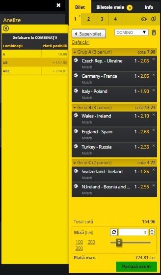 Ai un bilet de pariuri format din 3 grupuri (A,B și C) pe care îl plasezi cu o miză de 5 RON. Fiecare grup are următoarele specificații: Practic, biletul tău DOMINO este format din 3 bilete AKO. Pentru acest bilet de pariuri alegi să introduci o miză de 5 lei. Această miză va fi alocată primului grup de evenimente. În situația în care toate evenimente regăsite în grupul A au fost validate ca fiind câștigătoare, grupul generează un câștig total de 5x7.98=39,90RON. Câștigul grupului în valoare de 39.90 RON va fi divizat astfel: În situația în care cel puțin un eveniment din grupul B a fost validat ca fiind necâștigător, biletul tău va fi încheiat, indiferent de rezultatul grupului C, iar în soldul contului tău de joc va fi vizibilă suma garantată de la punctul 1, respectiv 19.95 RON. În situația în care toate evenimentele din grupul B au fost validate ca fiind câștigătoare, întregul grup va fi considerat câștigător, grupul generează un câștig total de 19,95 (reprezentând ½ din câștigul grupului A) x 13,23 (reprezentând cota totală a grupului B) = 263,938 RON. Acest câștig va fi divizat astfel: În situația în care cel puțin un eveniment din grupul C a fost validat ca fiind necâștigător, biletul tău va fi încheiat, iar în soldul contului tău de joc va fi vizibilă suma garantată de la punctul 1, respectiv 151,919 RON. În situația în care toate evenimentele din grupul C au fost validate ca fiind câștigătoare, întregul grup va fi considerat câștigător, grupul generează un câștig total de 131,969 (reprezentând ½ din câștigul grupului B) x 4,72 (reprezentând cota totală a grupului C) = 622,89 RON. În acest moment tot biletul tău de pariuri a fost validat ca fiind câștigător, astfel că în soldul contului tău de joc se va aloca atât suma garantată de 151.919 RON, pecum și câștigul de 622,89 RON rezultat din grupul C, astfel rezultând un câștig total de 774,809 RON (valoare va fi rotunjită la 774.81 RON).