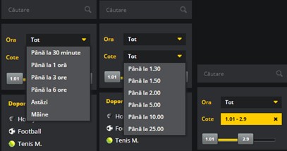 Fortuna îți oferă posibilitatea de a filtra oferta de pariere astfel încât să poți vizualiza doar evenimentele ce se încadrează în cerințele tale. Pe lângă opțiunea de a vedea oferta pe zile sau pe sport, Fortuna îți oferă posibilitatea de a selecta intervalul orar de începere a evenimentelor precum și cotele dorite.