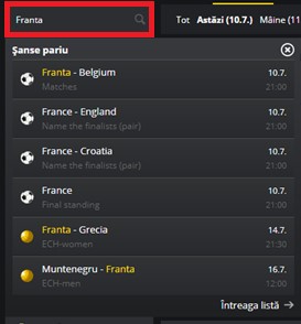 De asemenea, în cazul în care cauți un eveniment, ai posibilitatea de a utiliza câmpul de căutare care îți va afișa toate evenimentele, din toatesporturile, care conțin selecția menționată.