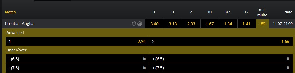 Te informăm că platforma Fortuna.ro îți va detalia în oferta inițială doar o parte a pronosticurilor disponibile pentru evenimentul respectiv. Pentru a putea vizualiza toate pronosticurile disponibile pentru un anumit eveniment, te rugăm să faci un click pe cifra ce este afișată în coloana ”mai multe”. Ulterior ți se vor detalia opțiunile puse la dispoziție.