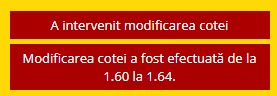 Te rugăm să reții că oferta de pariere pusă la dispoziție poate suferi modificări însă, în situația în care ai selectat un eveniment cu o anumită cotă iar aceasta este modificată în ofertă înainte ca tu să plasezi cu succes biletul de pariuri, în momentul în care vei apăsa butonul ”Pariază acum”, vei fi notificat printr-un mesaj de modificarea de cotă. Dacă esți de acord cu noua cotă, va fi necesar să apeși din nou pe butonul ”Pariază acum”.