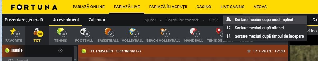 Fortuna îți oferă posibilitatea de a filtra oferta de pariere în funcție de preferințele tale, astfel că poți ordona toate evenimentele în ordine alfabetică sau poți alege să fie ordonate în fincție de ora de începere a evenimentelor