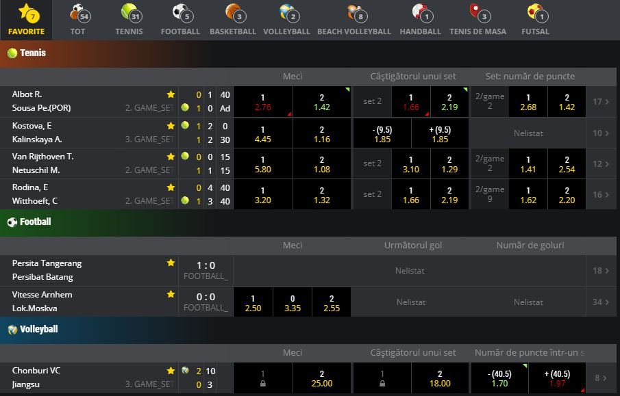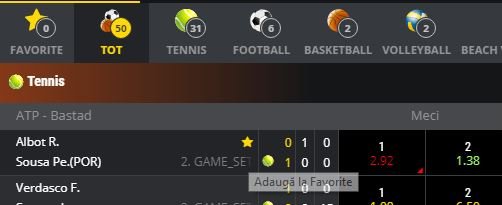 Secțiunea de Favorite îți oferă posiblitatea de a selecta anumite evenimente ce se regăsesc în oferta de LIVE a platformei pentru a le cumula într-un, astfel venind în ajutorul tău la plasarea rapidă a biletelor Pentru a adăuga un eveniment în secțiunea de Favorite, este necesar să apeși steluța dosponibilă îb dreptul evenimentului dorit După ce ți-ai ales toate evenimentele ce dorești să se regăsească în secțiunea de Favorite, poți selecta această secțiune. Ulterior, toate evenimentele selectate de tine vor fi afișate, acestea fiind divizate în funcție de sport.