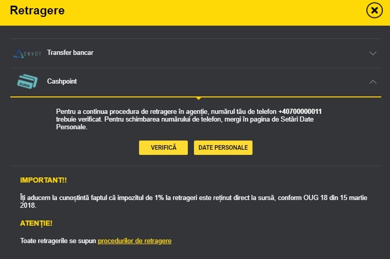 Pentru a verifica numărul de telefon, este necesar să te asiguri că numărul afișat pe pagina de retragere este într-adevăr cel pe care îl utilizezi. Dacă numărul de telefon a fost înregistrat corect, apasă butonul ”VERIFICĂ”, iar în maximum 20 de secunde vei primi un sms cu un cod de verificare. Dacă numărul de telefon pe care l-ai înregistrat în contul de joc a fost scris greșit sau nu mai este cel pe care îl utilizezi în prezent, apasă butonul ”DATE PERSONALE” și vei fi direcționat către pagina de setări a datelor de contact, unde vei putea modifica numărul de telefon. După ce modifici numărul de telefon, accesează din nou pagina de retragere Cashpoint și apasă butonul ”VERIFICĂ”.
